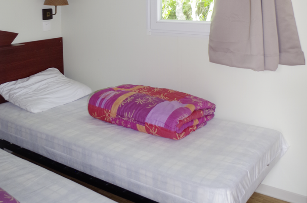 Ce Chalet de 33 m² pour 6 personnes est composé d’un coin cuisine équipée , d’un salon, d’une chambre avec un lit double ( 160 cm ), d’une chambre avec 2 lits simples, d’une chambre avec 2 lits superposés, d’une salle de bain et d’un WC séparé.